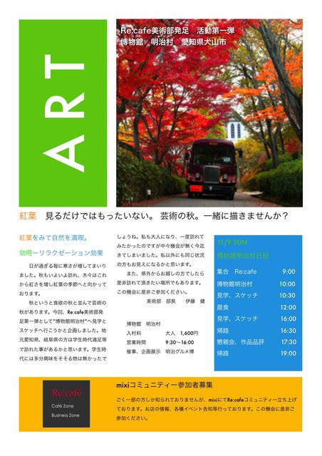 Re:cafe美術部発足 活動第1弾 芸術の秋 博物館明治村写生大会 食欲の秋、芸術の秋です。 紅葉を見がてら写生大会をしようと思います。 明治の建物と紅葉のコラボレーションです。 是非ご参加ください。