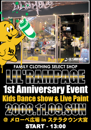ベイビー&キッズからメンズ&レディースまで幅広く展開するブランド「LIL'RAMPAGE」のフラッグショップ・オープン1周年を記念して11月9日にステラタウン大宮内にあるメローペ広場にてイベント開催が決定!! ステラタウンとリルランペイジのコンセプトに合わせたファミリー重視で作り出されたイベント内容はKIDSダンス発表会とグラフィティ・クルー「ACC(Asian Can Controlerz」によるライブペイント。 【強いガキになれ】の名の通りアツいKIDSがダンスで見せる!! GUEST DANCERには「BAV-WORKS(KIDS)」 と「LUCKY TWINS(KIDS)」、ACCから