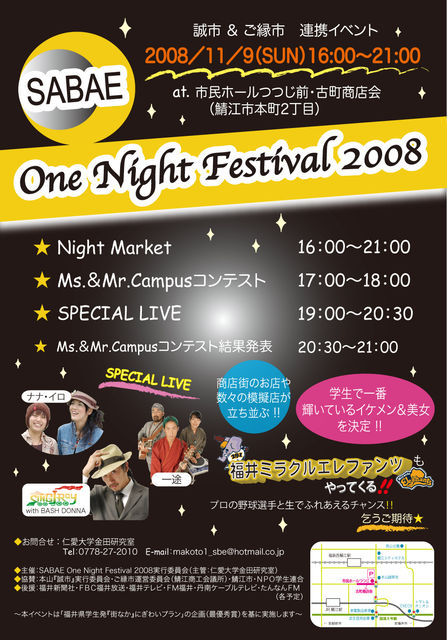 毎月第2日曜日に開催される、 「誠市」&「ご縁市」。 その夜市と題しまして、 「SABAE One Night Festival2008」 が開催されます! 日時 2008年11月9日(日)16時〜21時 場所 市民ホールつつじ、古町商店街 http://www.city.sabae.fukui.jp/pageview.html?id=1672 駐車場 古町商店街の東側 無料駐車可能 鯖江市嚮陽会館前(西山公園南側)駐車場(2時間無料) プログラム 16:00〜21:00 Night Market 17:00〜18:00 Ms.&Mr.Campusコンテスト 19:00〜20:30 SPECIAL LIVE 20:30〜21: