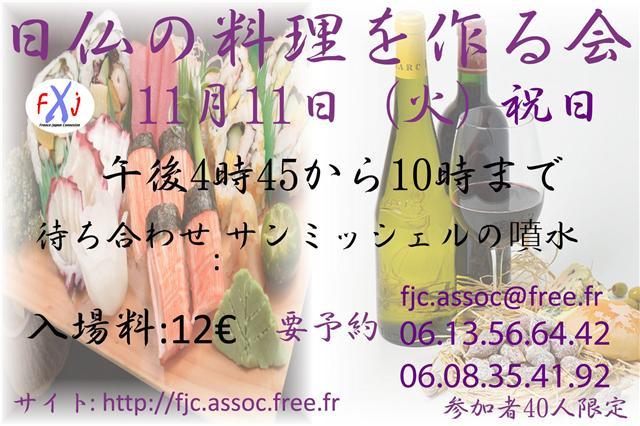 日仏交流を目的とするアソシエーションFrench-Japan Connexionが、スペシャルイベントを開催します Saint-Michel の広いキッチンで日仏料理交換を行います。 フランス人とフランスの伝統的な料理をしましょう♪ その一方で、フランス人は日本料理を作りますので、お互いに交換をしましょう。 料理が上手にできる様に、フランス人と日本人の先生がお手伝いをしてくれます。 そして、料理を作ってからみんなで夕ご飯を食べます。 フランス語を上達させるいい機会です 日時 :11月11日(祝日)16時45分〜22時頃