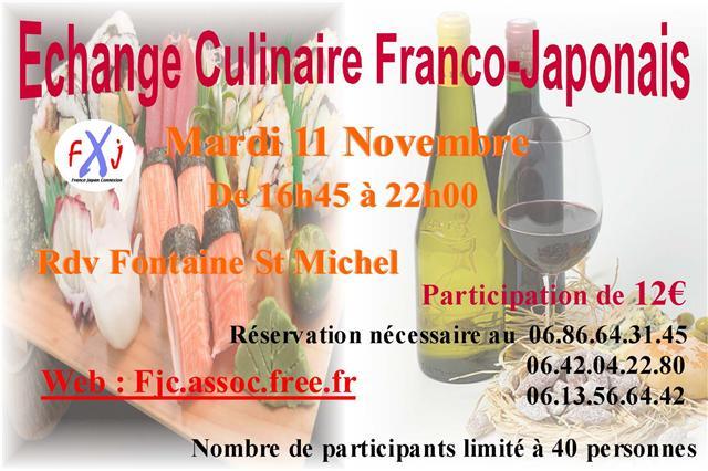 French-Japan Connexionが、スペシャルイベントを開催します! Saint-Michel の広いキッチンで日仏料理交換を行います。 フランス人とフランスの伝統的な料理をしましょう♪ その一方で、フランス人は日本料理を作りますので、お互いに交換をしましょう。 料理が上手にできる様に、フランス人と日本人の先生がお手伝いをしてくれます。 そして、料理を作ってからみんなで夕ご飯を食べます。 フランス語を上達させる機会です 日時 :11月11日(祝日)16時45分〜22時頃 集合場所:Saint-Michel(サンミッシェル)の