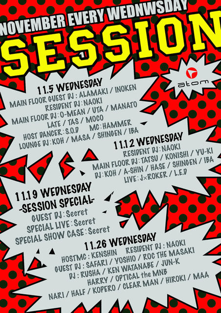管理人様告知失礼します! おなじみ渋谷のclub atomにて毎週水曜レギュラーイベント"SESSION"です! 選曲はHIPHOP,R&Bメインで、週末とはひと味違うatomでぜひ踊り明かしてください♪ エントランス1000円のゲストとるんでぜひぜひ連絡ください! ★11月12日wed SESSION@渋谷atom open21:00 ゲスト料金¥1000/ No Drink Resident DJ: NAOKI Main Floor DJ: TATSU, KONISHI, YU-KI DJ:KOH, A-SHIN, HASE, SHINGEN, IBA LIVE:J-ROKER, L.E.D