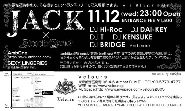 CLUB GYPSY PRESENTS SPECIAL INVITATION MAIL -------------------------------------------------------------------------------- JACK "Lux‐B" meets ambone Supported By:HailMary Inc. -------------------------------------------------------------------------------- 11/12(wed) At.Velours Start 23:00 - Fee.1500YEN -------------------------------------------------------------------------------- STREET WEAR ambone http://www.ambone.com ambitian(志) music(音楽)