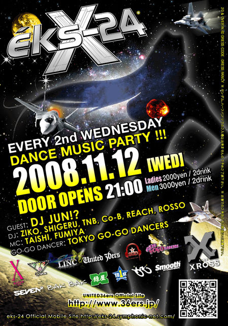 ☆2008.11.12(WED) ★eks-24@CLUB XROSS ☆EVERY 2nd WEDNESDAY ★DANCE MUSIC PARTY!!! ☆DOOR OPENS 21:00 ★Ladies 2000yen/2d,Men 3000yen/2d 東京エリアの夜を遊びつくす! 西麻布[CLUB XROSS]にて新たなスタイルのパーティーが始まる! [eks-24] ”エックス・トゥエンティーフォー”「未知との遭遇」をコンセプトに、お洒落好き、音楽好きが集まるワンランク上のパーティーを提案します。 選曲を担うDJは、東京を始め日本全国を駆け回るDJ ZIKOを筆頭に、キャリア抜群のDJ陣による様々なジャンルの幅広い選曲(DANCEMUSIC