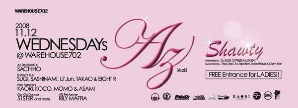 毎週水曜、平日とは思えない盛り上がりを見せているParty "AZ Wednesdays" 毎月第2水曜はDJ SUGI & Cypress Muzik Ent. Presents "Shawty" •女性は入場無料!! • 男性の方は"LIL JUNディスカウント”って入り口で言ってもらえれば\1,000です •11月生まれも入場無料!! ☆★☆AZ Wednesdays "Shawty"☆★☆ Presented by : DJ SUGI & Cypress Muzik Ent. Supported by : Trap Starz, Explosion, 54, Uncut Flava & Glam Star ☆11/12 (Wed) @ 麻布十番 Warehouse702 ☆Open 23:00 ☆En
