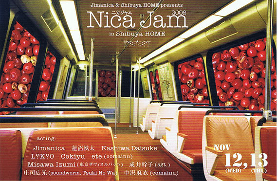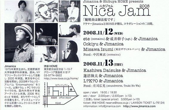 告知失礼致します。 コマイヌ出演イベントのご案内です。 Jimanica & 渋谷Home presents ニカジャム2008 in Shibuya HOME 11/12 (wed) ete (コマイヌ) & 成井幹子(sgt.) & Jimanica Cokiyu & Jimanica Misawa Izumi (東京ザヴィヌルバッハetc...) & Jimanica 11/13 (thu) Kashiwa Daisuke & Jimanica L?K?O & Jimanica 蓮沼執太 & Jimanica FOOD : 庄司広光(soundworm, Tsuki No Wa) open / start 19:00 / 19:30 adv / door 2000yen / 2500yen (+1D) 二日通しticket (special price!) 3,500yen (+1D) ticket: 渋谷HOME