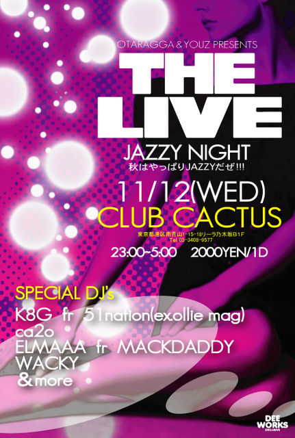 2008/11/12(wed) 「THE LIVE」 ~SPACEY JAZZY NIGHT ~ ♪JAZZY HIP HOP.DANCE MUSIC♪ (OLD MIDDLE,NEW SCHOOL・・・etc!!!) -SPECIAL MUSIC DJ'S- ■K8G fr 51nation(ex.OLLIE mag) ■DJ ca2o ■DJ ELMAAA fr MACK DADDY ■DJ WACKY -OPEN-20:00〜 -START-23:00〜5:00 -ADM-2000/1D *****「THE LIVE」 ☆SPACEY JAZZY NIGHT☆***** OTARAGGA×YOUZ presentのParty THE LIVE!!! 毎月第2水曜のど真ん中にも関わらずパーリーピーポー(DJ&お客様)達が集まり、毎回音楽とお酒を思う存分楽しみ、