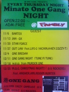 11月13日木曜日は ついにやってきました 9月あたりから予定されていた @FAMBLY にて MINATO ONE GANG NIGHT EVERY Thursday Night にお邪魔します 【OPEN】22:00〜 【ADM】FREE 【11月13日 GEST SOUNDで JA-OX参加しにいきます】 横浜来たらよろしくお願いします