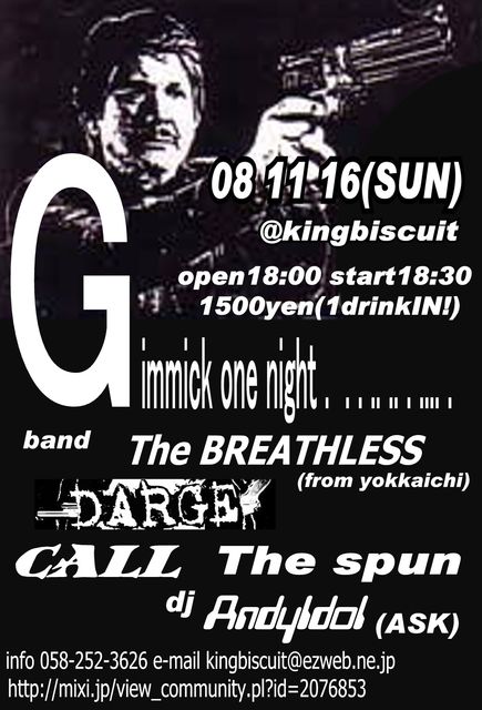 スペースお借りします!! <<GIMMICK ONE NIGHT 08 11/16(SUN) @kingbiscuit>> band :The BREATHLESS(from yokkaichi) http://www.myspace.com/breathlessweb :DARGE http://profile.myspace.com/index.cfm?fuseaction=user.viewprofile&friendid=1001022203 :The Spun :CALL dj :AndyIdol(A.S.K) :open18:00 start18:30 :\1500(1drinkIN!!) :kingbiscuitmixicommuinity http://mixi.jp/view_community.pl?id=2076853 ☆四日市よりキンビス久々の登場です!NEWベーシスト加入!いよいよ再始動のThe