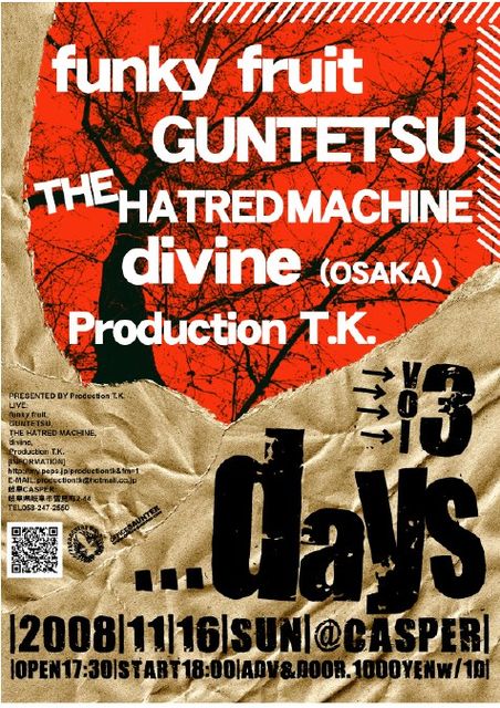 2008.11.16(sun) Production T.K. presents 『...days』vol.3 @岐阜CASPER ・BAND・ ■funky fruit ■GUNTETSU ■THE HATRED MACHINE ■divine(OSAKA) ■Production T.K. OPEN/17:30 START/18:00 TICKET:ADV&DOOR/1,000(+1drink) 今回は僕達『Production T.K.』のオーガナイズイヴェント『...days』の第3弾&1st Anniversaryとなります(*^ω^) ゲストも『超』個性溢れるバンドが揃っております(。・`∀´・。) SKA PUNKを主体として、此れから岐阜・名古屋で活躍して活くであろうGIRL'S VOCAL POP BAND