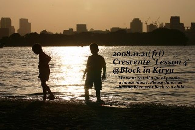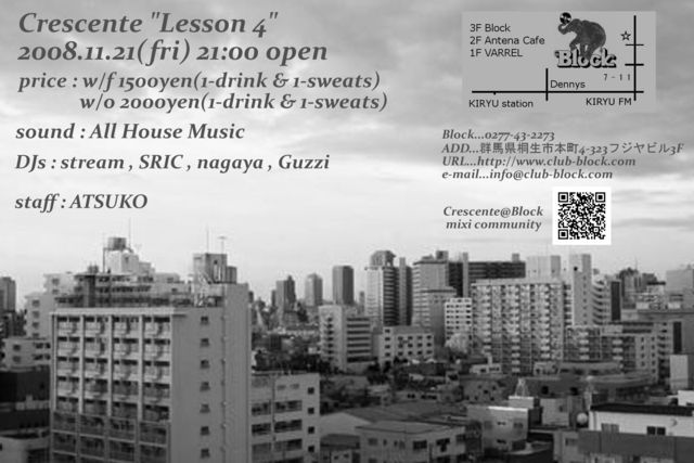 管理人様告知失礼します。 Crescenteは群馬は桐生市、BLOCKで行われるHOUSE MUSIC PARTYです。 Crescente[クレッシェンテ]はイタリア語で「成長」が語源。 色んな面で成長したい。でも音に対しては子供でいたい。 そんなPARTYです。 聞きやすいHOUSEを選曲するのでクラブ初心者でも楽しめるPARTYです。 Crescenteの主役はお客さんです。 目立っちゃいましょっ。 ******************************************* 2008.11.21(fri) Crescente"Lesson 4" place : BLOCK in KIRYU price : ADV-1500yen(1-dri