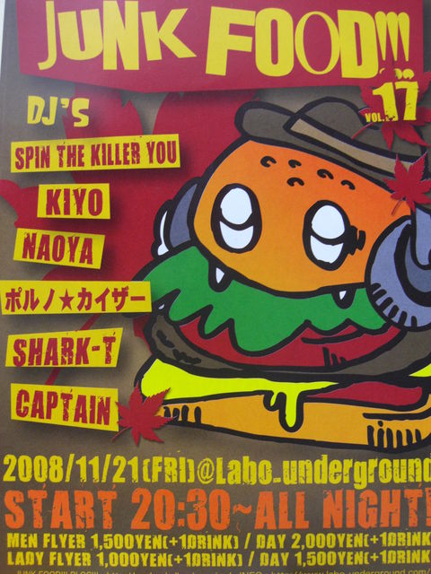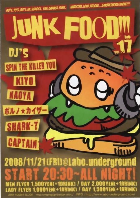 ♪毎奇数月第三金曜はJUNKの日♪ ★JUNK FOOD!!! Vol 17★ 2008/11/21 AT Labo_underground FLYER MEN 1500YEN(1D) DAY 2000YEN(1D) FLYER LADY 1000YEN(1D) DAY 1500YEN(1D) 20:30〜ALLNIGHT SELECTER CAPTAIN /SHARK-T / ポルノ☆カイザー/ KIYO/ NAOYA/SPIN THE KILLER YOU 60's.70's.80's90'S.UK.USRock.SKA. GARAGE.PUNK.HARDCORE.LOUD. REGGAE...&more!more!!more!!! JUNK FOOD!!! ブログはコチラから・・ http://yaplog.jp/banjax-miyu/ JUNK FOOD
