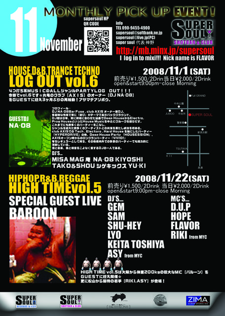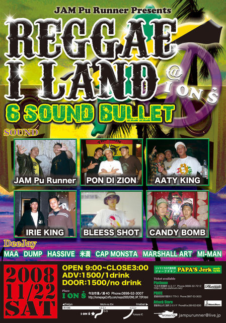 2008 11/22 (SAT) Place 今治湯ノ浦 ION`S JAM PuRunner Presents REGGAE I LAND OPEN9:00〜CLOSE3:00 ADV:1500/1drink DOOR:1500/no drink SOUND JAM PuRunner (今治) PON DI ZION (四国中央市) AATY KING (松山) IRIE KING (松山) BLESS SHOT (松山) CANDY BOMB (松山) DEEJAY MAA (今治) DUMP (今治) HASSIVE (松山) 米満 (松山) CAP MONSTA (松山) MARSHALL ART (松山) MI-MAN (西条) FOOD PAPA`S Jerk (M2) 偶数月第4土曜日に今治湯ノ浦ION`Sにて、毎回行っておりますSOUND I LANDからJAM PuR
