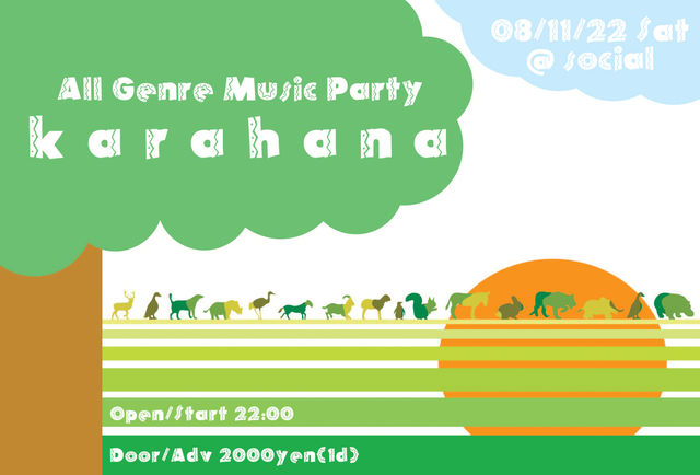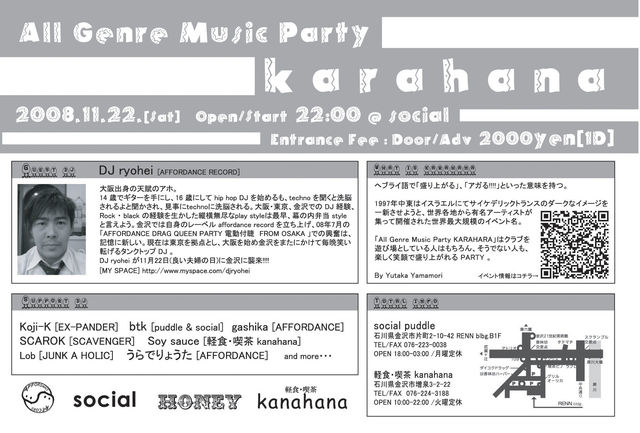 ※告知失礼します。 ◆イベント名◆ 「All Genre Music Party karahana」 ◆開催日◆ 2008年11月22日(土) ※良い夫婦の日(爆) ◆時間◆ open/start 22:00 ◆金額◆ 2000yen(1drink) ◆場所◆ puddle & social puddleコミュ→http://mixi.jp/view_community.pl?id=2527364 socialコミュ→http://mixi.jp/view_community.pl?id=254309 ◆What Is karahana ??◆ ヘブライ語で「興奮する」「アガる!!!!」といった意味をもつ。 1997年中東はイスラエルにてサイケデリックトランスのダー