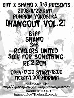 横浜で爆走中のBiFFx軍ss鶏x3☆8の3バンドによる合同企画第2弾HANGOUT vol.2!! 第2弾の今回は会場を横浜から横須賀に移しての開催!! HANGOUTが自らの目で選りすぐり集めたバンド達と共に満を持しての開催!! 2008/11/22(土) 横須賀かぼちゃ屋 [BiFFx軍ss鶏x3☆8 presents!!HANGOUT vol.2] BiFF 軍shamosound鶏 3☆8 レヴェラーズ・ユナイテッド Seek For Something Re:2.2cm OP/ST 17:30/18:00 TICKET 1,000(D代別) 当日は入場特典としてバッヂとステッカーを配布します! 数に限りがあるので早めの