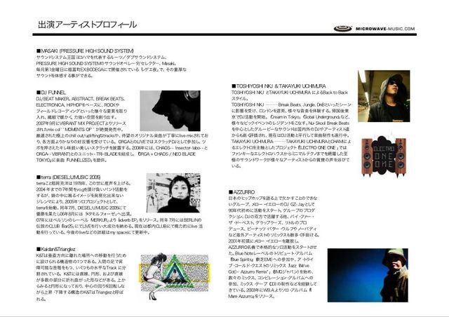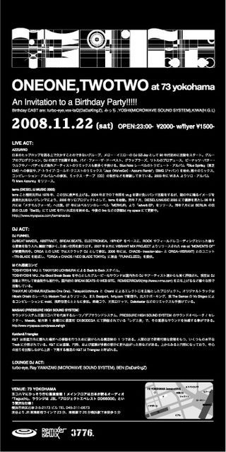 告知、おじゃまいたします。 横浜で、遊ぶ場所を探している、特に音にうるさい人。 あと安心できる場所を探している人。 いいパーティがございます。 集まる人たちもピースフルです。 1122(ONE ONE,TWO TWO) 〜An invitation to a Birthday PARTY!!!~ at 73 yokohama http://info.73yokohama.com/ http://www.73.yokohama.walkerplus.com/ Birthday CAST are: Turbo-eye,vex-taQ(DaDakingZ),micchi,Yoshi(MICROWAVE SOUND SYSTEM),KIWA(H.G.L) ■ 2008.11.22(sat) 23:00- ■ entrance fee 2,000(w/flyer 1.500)