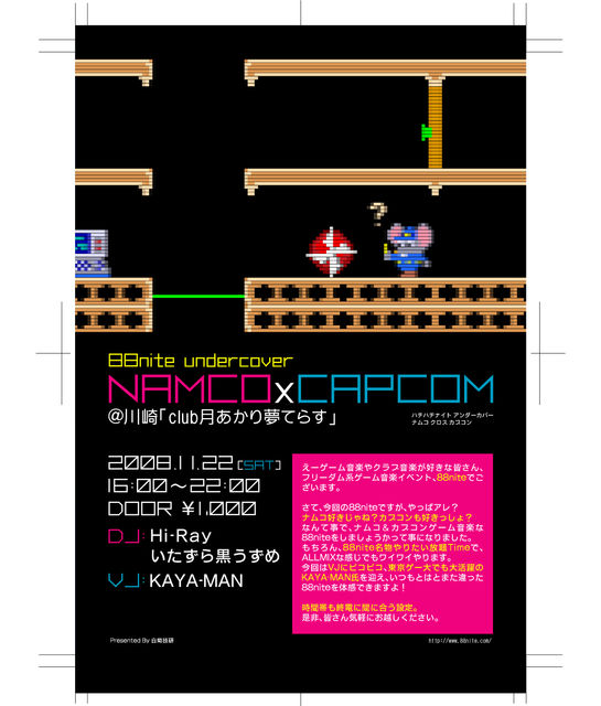 88nite undercover 〜NAMCOxCAPCOM〜 @川崎「club月あかり夢てらす」 11/22(土) 16:00〜22:00 DOOR \1,000 DJ:Hi-Ray(ひらいしん) いたずら黒うずめ VJ:KAYA-MAN ジャンル:ゲーム音楽系クラブイベント えーゲーム音楽やクラブ音楽が好きな皆さん、フリーダム系ゲーム音楽イベント、88niteでございます。 さて、今回の88niteですが、やっぱアレ? ナムコ好きじゃね?カプコンも好きっしょ? なんて事で、ナムコ&カプコンゲーム音楽な88niteをしましょうかって事になりました。 もちろん、88nite名物やりたい放題Timeで、