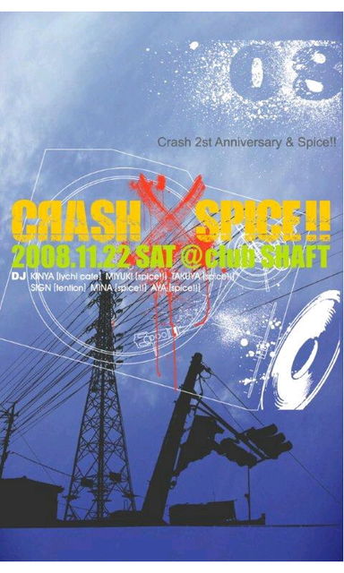 『CRASH×SPICE』 2008.11.22(SAT) 22:00〜LAST @SHAFT …ALL MIX PARTY… DJ KINYA (LYCHI CAFE) TAKUYA(SPICE!! CRASH) MIYUKI(SPICE!! CRASH) MINA (SPICE!!) AYA (SPICE!!) SIGN (TENTION) 今週土曜日でCRASH2周年です!! 誰でも気軽に来れるイベントなのでぜひ遊び