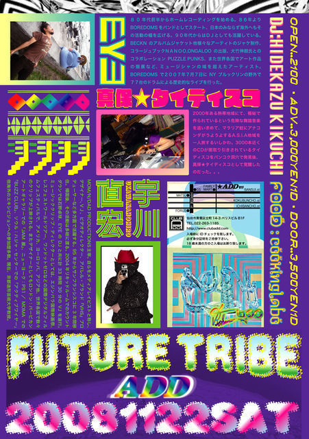 GUEST DJ: EYE(BOREDOMS / V∞REDOMS) 真保★ タイディスコ DJ:ヒデカズ キクチ VJ:宇川直宏 FOOD:cookinglabo OPEN 22:00 ADV 3,000YEN/1D・DOOR 3,500YEN/1D INFORMATION CLUB ADD 022−263−1185 http://www.clubadd.com/ http://www.clubadd.com/m ●EYE 80年代前半からホームレコーディングを始める。 86年よりBOREDOMSをバンドとしてスタート、日本のみならず海外へもその活動の幅 を広げる。90年代からはDJとしても活躍している。BECKNのアルバムジャケット他様々