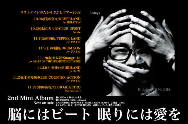 告知失礼いたします。 「ロストエイジのたからさがしツアー2008」 11月22日(土)仙台BIRDLAND Op/19:00 St/19:30 Ticket 前売:\2,000/当日:\2,500 w/54-71 【SENDAI BIRDLAND】 Tel:022-223-7926 mail:info@sendai-birdland.com http://sendai-birdland.com/ 上記の連絡先、メアドでもチケット予約を受け付けしておりますが、 当方のメッセでもチケット予約を承っております。 予約分に関しましては前売料金でオーケーです。 お気軽にお問い合わせ下さい。 ※管理人様、多大なるスペースの提供誠にありがとうございま