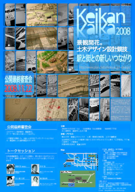 管理人様 不適切でしたらお手数ですが削除お願いします。 書き込み失礼致します。 東北大学 景観研究室の者です。 2008年度土木デザインコンペ『景観開花。』最終審査会の告知をさせていただきます。 ◎概要 景観開花は「設計競技」ならびに「トークセッション」を行うことで土木デザインに関心のある若年の力を試す場を提供すると同時に、多くの人々に土木デザインの可能性を示すことを目的として開催しています。 ◎テーマ 『駅と街との新しいつながり』 街に必要な「顔」としての駅、そして駅前はどのような場所であるべ