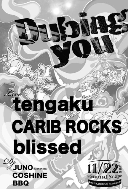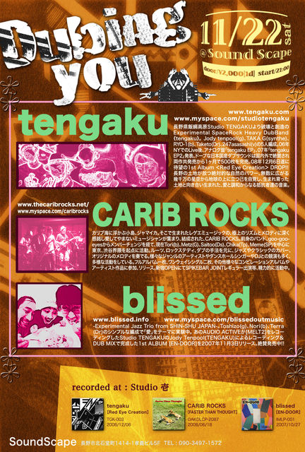 tengaku 1st Album 「Red Eye Creation」Release party! 2008/11/22(sat) 「Dubing You」@Soundscape Live tengaku (http://www.tengaku.com http://www.myspace.com/studiotengaku) CARIB ROCKS (http://www.thecaribrocks.net/ http://www.myspace.com/caribrocks) blissed (http://www.blissed.info http://www.myspace.com/blissedoutmusic) DJ JUNO (Mancheez) COSHINE BBQ (IN MY LIFE PRODUCTION) 【tengaku】 長野県飯縄高原にある "Studio TENGAKU" より 破壊と創造のExperim