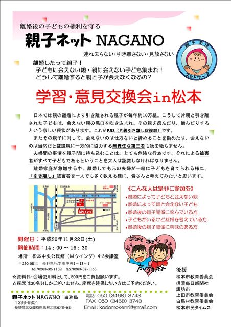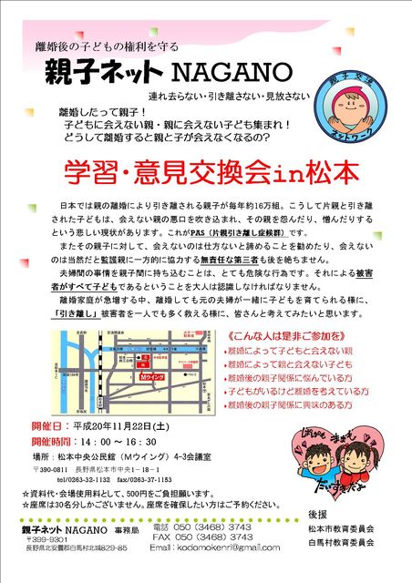このたび、『親子ネットNAGANO』を旗揚げし、長野県を中心に活動をすることとなりました。 その活動の一環として、長野県松本市にて交流会を開きます。 皆さんのお越しを切望します。(^_^;) −記− 事業名:『学習・意見交換会in松本』 開催日:2008年11月22日(土) 場 所:松本中央公民館(Mウイング) http://www.city.matsumoto.nagano.jp/tiiki/sisetu/kominkan/chukou/ 〒390-0811 長野県松本市中央1−18−1 tel/0263-32-1132 fax/0263-37-1153 時 間:14:00〜