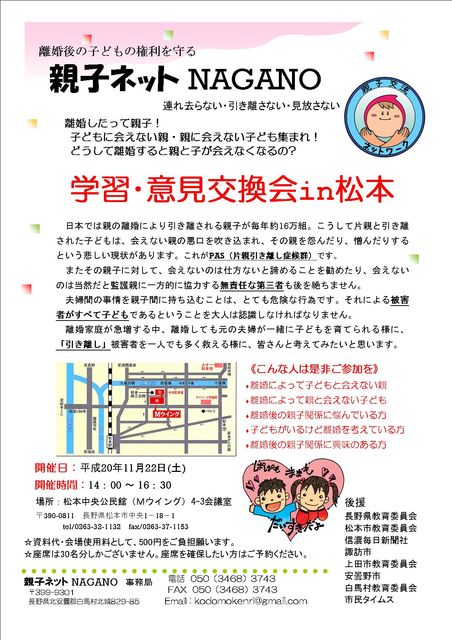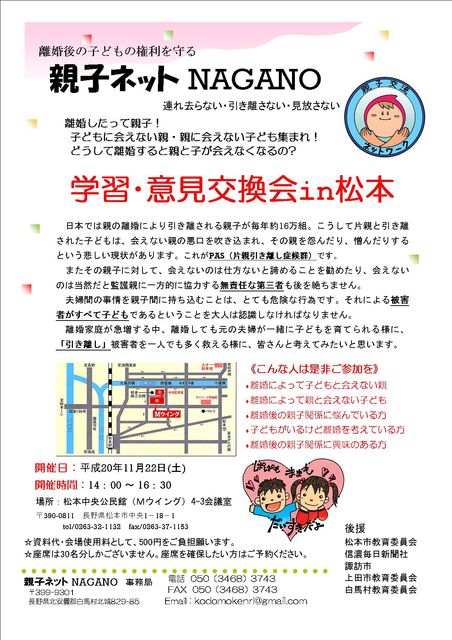 【広報】11/22(土)親子ネットNAGANO 『学習・意見交換会in 松本』 このたび、『親子ネットNAGANO』を旗揚げし、長野県を中心に活動をすることとなりました。 その活動の一環として、長野県松本市にて交流会を開きます。 皆さんのお越しを切望します。(^_^;) −記− 事業名:『学習・意見交換会in松本』 開催日:2008年11月22日(土) 場 所:松本中央公民館(Mウイング) http://www.city.matsumoto.nagano.jp/tiiki/sisetu/kominkan/chukou/ 〒390-0811 長野県松本市中央