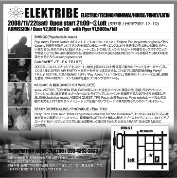 ELEK TRIBE ELECTRIC/TECHNO/MINIMAL/HOUSE/FUNKY/LATIN 2008.11.22 Open start 21:00〜 Loft@長野県上田市中央2-13-10 ADMISSION Door¥2,000 (w/1d)/with Flyer¥1,500(w/1d) GUEST Dj SHINGO(Psychedelic Aeen) www.psyaeen.net Resident Dj’s CAKRA(天竺) KEISUKE(another wise/天竺) SEKKY(ADRENALINE) JO-JI(another wise/天竺) INFORMATION PHONE 0268-27-0286 / 090-4393-233 SHINGO《Psychedelic Aeen》 Psy Aeen、Exotic Native のDJ として これまでoutback Eclip