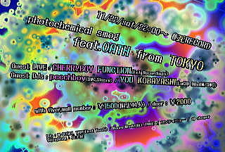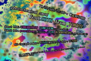◆photochemical smog feat.OATH from TOKYO◆ 【DATE】 11/22(sat) 22:00〜till you leave 【PLACE】 瓦RECORD 【参加費】 with flyer,mail member: ¥1500(限定44人) / door: ¥2000 【Guest LIVE】CHERRYBOY FUNCTION(ExT Recordings) 【Guest DJs】 peechboy(SWC,Sleezy) / YOU KOBAYASHI(LuCID DReAM/SWC) 【DJs】 M-$E(ALL THAT,First Touch) / Kaoru Misaki(ALL THAT) / コンティニュー / dj sleeper 【VJ,Lighting】 此土屋 【凸】 山子L -lounge- 【DJs】 Kaoru Misaki(ALL THAT) &more... ===TECHNO,MINI