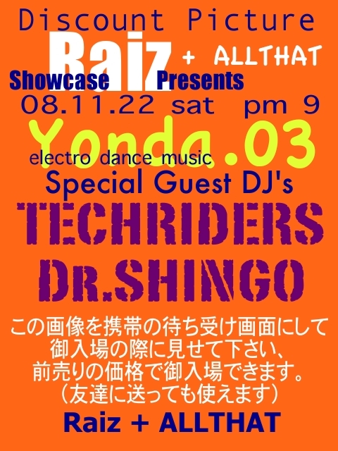 今回のYondaは、ワールドワイドに活躍してます、 WOMBとのコラボ!!! ゲストにDr.SHINGOと長野県初のTECHRIDERSが 来てくれちゃいます!!! ぜひ、最先端エレクトロニックミュージックを 堪能してください。 尚、今回、ディスカウント画像をアップしますので、 この画像を携帯の待ち受けにして受付で見せると、 前売りの値段で入場できますのでよろしくお願いします! 11/22(sat)@Raiz Raiz Presents [ALL THAT PARTY"Yonda"vol3 feat.WOMB NIGHT] *Guest DJ's* Dr.SHINGO(HIGHLAND) http://www.myspace.com/drshingo