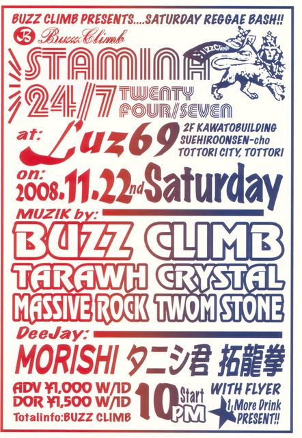 STAMINA 24’7 [REGGAE] ■2008/11/222 sat OPEN/START 22:00- ■@LUZ69 ■SOUND BuzzClimd MassiveRock TwomStone ■Deejay MORISHI タニシ君 拓龍拳 ■ADV \1000(w1D) ■DOOR \1500(W1D) ☆WITH FLYER 1More Drink PRESENT!! ※チケット取り扱い WORLD 0857-31-2213 RAW LIFE 0857-29-1609 ☆☆今回はなんと WITH FLYER 1More Drink PRESENT!! 毎月第四土曜日は BUZZ CRIMB PRESENTS......SATURDAY REGGAE BASH!!
