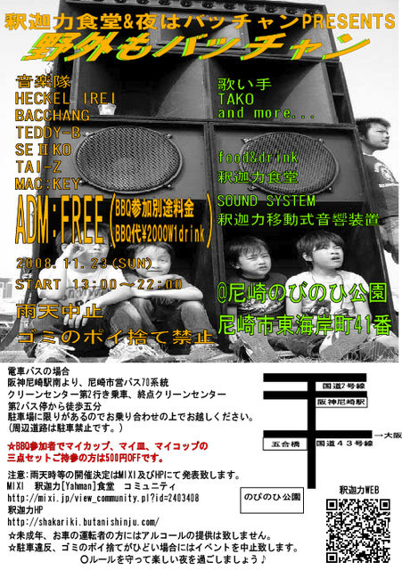 管理人殿 告知失礼致します。 釈迦力食堂&夜はバッチャンpresents "野外もバッチャン" 音楽隊 HECKEL IREI BACCHANG TEDDY-B SE?KO TAI-Z MAC;KEY 歌い手 taco and more... SOUND SYSTEM 釈迦力音響装置 FOOD&DRINK 釈迦力食堂 2008.11.23(SUN) 13:00〜22:00 ADM:FREE(BBQ参加者別途料金 BBQ代¥2000with1drink) 雨天中止 ゴミのポイ捨て禁止 AT:尼崎のびのび公園 尼崎市東海岸町41番 電車・バスの場合 阪神尼崎駅ミナミより、尼崎市営バス70系統