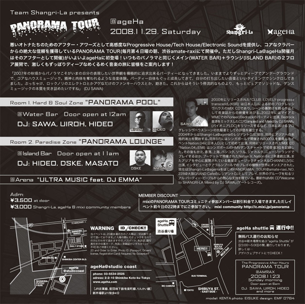 PANORAMA TOURは毎月第4日曜の早朝に渋谷アマテラグジーにて開催中!(ただしShangri-La@ageHa開催月はそのアフターとして開催します)