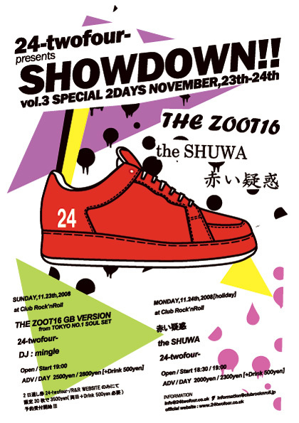 管理人様、告知失礼します。 24-twofour-presents "SHOWDOWN"に 渡辺俊美さんが登場です。 名古屋にTHE ZOOT16がやってくる!!! 皆さまどうぞ遊びに来てください☆ 詳しくはhttp://www.24twofour.co.uk/にて。 チケット予約はinfo@24twofour.co.ukまで!!! 11/23(sun) 名古屋 新栄CLUB ROCK'N'ROLL <CLUB ROCK'N'ROLL 16th ANNIVERSARY 前祝い公演> 24-twofour- Presents SHOW DOWN vol.3 SPECIAL 2DAYS 2man THE ZOOT16 GB VERSION(from TOKYO NO.1 SOUL SET) 24-twofour- DJ:mingle o/s 19:00 adv/day 2500y