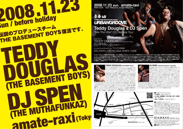 11月23日(日-祝前日-) at AMRAX -amate-raxi- OPEN22:00 DOOR:4000yen w.f.:3000yen 15 Years of King Street Sounds URBANGROOVE feat. Teddy Douglas & DJ Spen " MIX THE VIBE" CD Release Party ■Teddy Douglas (Basement Boys) ■DJ Spen (The Muthafunkaz / Code Red) LOUNGE FLOOR : T.U.G. United KAZ/KENTA/SACHIO/KAJI/OHISHI/YUMIE カッティングエッジな都会の音を刻み続け、NYを代表しハウスミュージックシーンを牽引するキングストリートサウンズが、設立15周年の今年に満を持して立ち上げたパーティー「UR