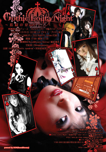 ごきげんよう、当コミュ管理人のMOMOKAでございます。 私はゴシックロリータファッションで歌うソロアーティストでございます。 毎月『監獄の密会』と題して、「Gothic」をテーマとしたイベントのプロデュースをしております。 当イベントではご来場くださるお客様・参加してくださるアーティストさまやブランドさまを大募集しております。 どうぞよろしくお願いいたします。 詳細をご紹介いたします。 2008年11月23日(日) 【東中野プリズントーキョー】 http://www.prison-tokyo.net/ 東中野プリズントーキョー様主催produced by