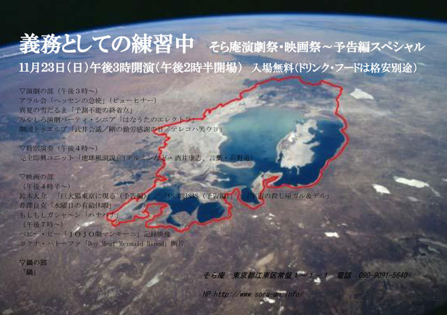 「そら庵演劇・映画祭(ついでに鍋祭)〜予告編スペシャル」は、 11月23日(日)午後3時開演(午後2時半開場)です。 最終決定プログラムは次の通りです。 ☆義務としての練習中 そら庵演劇祭・映画祭〜予告編スペシャル 11月23日(日)午後3時開演(午後2時半開場) 入場無料(ドリンク・フードは格安別途) ▽演劇の部(午後3時〜) アラル会「ヘッセンの急使」(ビューヒナー) 真夏の雪だるま「予測不能の終着点」 みやしろ演劇パーティ・シニア「はなうたのエレクトラ」 劇団トゥエルブ「武井会議/剛の勤労