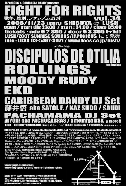 2008.11.23(sun) FIGHT FOR RIGHTS Vol.34 @ SHIBUYA LUSH open/start djs:23:00 /start:24:00 (all night) tickets: 2,800/3,300 (+1D) info: lush 03-5467-3071 / http://www.toos.co.jp/lush featuring... DISCIPULOS DE OTILIA (from Barcelona) ROLLINGS MOODY RUDY EKD CARIBBEAN DANDY DJ Set SATOL. F KAZ SUDO (ZOOT SUNRISE) RYOH aka PACHUCABRAS (LONDON NITE) Discipulos de Otilia (profile) バルセロナ出身、RADIO CHANGOのSKA PUNKバンド DISCIPULOS DE OTILIA(ディスシプロス デオティリーア)。バルセロナ
