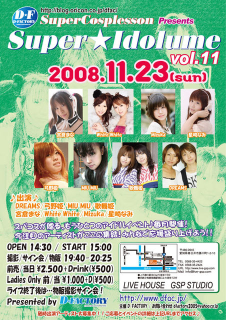 スパコスPresent's 『Super☆Idolume vol.11』 日時:2008.11.23(sun) 会場:LIVE HOUSE GSP STUDIO 出演: ・White☆White ・歌舞姫(おちゃっぷす) ・Mizuka ・星崎なみ ・宮倉まな ・黒木ミウ(MIU MIU) ・弓野姫 ・DREAMS ※出演順未定 OPEN:14:30 START:15:00〜 撮影サイン会・物販:19:40〜20:25 前売・当日:\2,500+D(\500) Ladies Only \1,000+D(\500) ☆チケット予約は各アーティストからかhttp://www.dfac.jp/form.htmlから