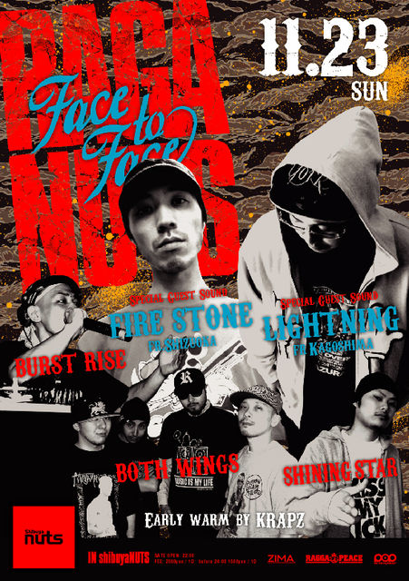 RAGANUTS @Shibuyanuts 2008年11月22日(日)祝前日 OPEN/START 22:00 FEE:\2500(1D) Before24:\1500(1D) 【SPECIAL GUEST SOUND】 LIGHTNING(from KAGOSHIMA) FIRE STONE(from SHIZUOKA) 【SOUND】 BURST RISE BOTH WINGS SHINING STAR 【EALRY WARM】 KRAPZ