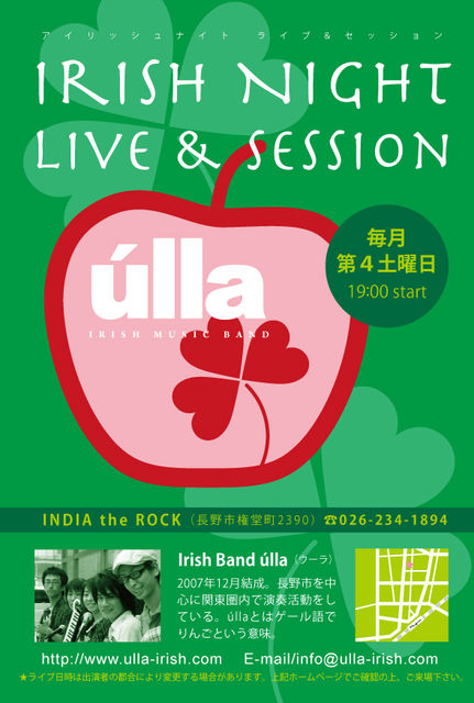 「アイリッシュ ナイト ライブ&セッション」 日時:2008年11月23日(日・祝)19時〜 出演:アイリッシュバンドulla http://www.ulla-irish.com/ 会場:INDIA the ROCK(長野市権堂町2390) 料金:ワンドリンクオーダー(500円) セッション参加歓迎します! 楽器(なんでもOK!)を持参ください。