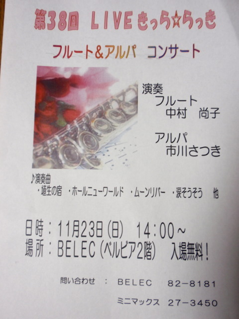 今回はアルパとフルートコンサートです 午後のひととき 音楽と共に過ごしてみるのはいかがでしょうか? アルパ 市川さつき フルート 中村尚子(きっら☆らっき初登場) 入場無料です 御来場お待ちしてますm(_♪_)m