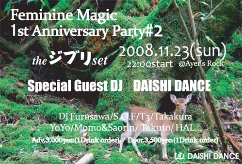 先日の#01はたくさんのご来場誠にありがとうございました− Feminine Magic 1st Anniversary Party#02いよいよです 今回も皆様、大集合よろしくおねがいしま−す DAISHI DANCE 今年4/18以来の2回目の長崎です 7月に発売された、ジブリの名曲をハウスにカバーしたアルバム “the ジブリ set”はもちろん、彼の名曲・PLAYに触れられる絶好の機会です 今回は3階『リブロック』をラウンジにしての2会場での開催予定です 『Feminine Magic 1st Ann