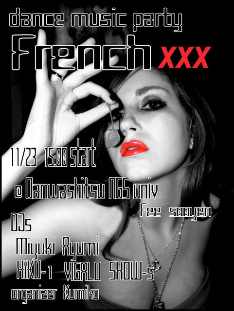 管理人様、告知失礼いたします。 今月行われる長崎大学祭最終日! 大学構内の一角を借りきって、dance music partyを行います! その名も「French XXX」 普段はちょっと怖くて行きにくいクラブ・・・ そんなクラブの雰囲気と音を大学生たちダケでリアルに追及! 主催もDJもモチロン同じ「学生」です 本格的なクラブサウンドシステムを導入し、 Techno,House,Hip-Hop,R&B,Rockを軸としたオールジャンルParty! GoodSound&GoodMusicをすべてのGood Music Loverへ捧げます☆ 普段怖くてクラブに行き