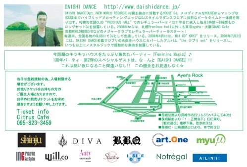 ◇管理人様 告知失礼致します◇ DAISHI DANCE 今年4/18以来の2回目の長崎です 7月に発売された、ジブリの名曲をハウスにカバーしたアルバム “the ジブリ set”はもちろん、彼の名曲・PLAYに触れられる絶好の機会です 今回は3階『リブロック』をラウンジにしての2会場での開催予定です 『Feminine Magic 1st Anniversary Party#02』 2008.11.23(sun)22:00start@Ayer's Rock長崎市 Special Guest DJ:DAISHI DANCE DJ:Furusawa/S.O.F/T3/Takakura/YoYo/Momo&Saorin/