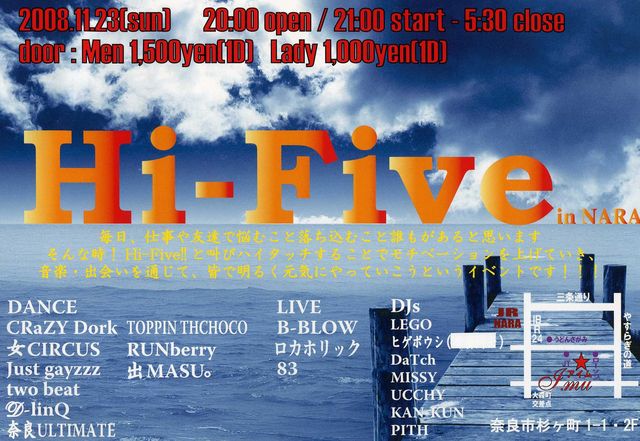 『Hi−Five in NARA』 いつもは、天理でやらしてもらってるEventを、今回は奈良市内に場所を移し、会場もデカめに、Show Caseも入れてPOWER UPしてお贈りします!! 細かい詳細はこちら ↓ 日時→2008,11,23(SUN) 場所→奈良市杉ケ町1−1・2F@『I.mu』(アイム) (近くに、うどんのさがみがあって、JTとローソンの間のビルです) 時間→OPEN 20:00 CLOSE 5:30 料金→Men 1,500yen(1Drink) Lady 1,000yen(1Drink) Genre→Hip Hop・R&B・REGGAE・House・Disco Number・and GOOD MUSIC!! Show Case 【D