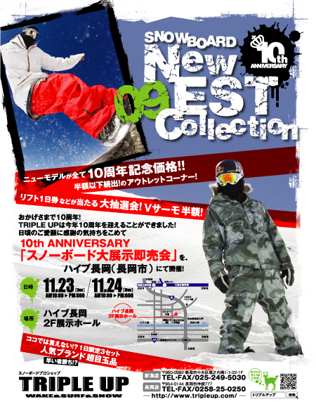 おかげ様で【TRIPLE UP】は今年でオープン10周年を迎えることが出来ました! ここまでこれたのも、皆様からのご愛顧と感謝しております m(_ _)m そこで、TRIPLE UPではオープン10周年を記念し、2009年モデルを一同に揃えたニューモデルスノーボード展示即売会 【2009 NewEST collection】 を『長岡市』で開催します! ★会期中、ニューモデルスノーボード用品が全て10周年記念特別価格♪ ★半額以下続出のアウトレットコーナーあり♪(ココでは言えません) ★リフト1日券や苗場プリンスホテル宿泊券などが当たる大抽選会