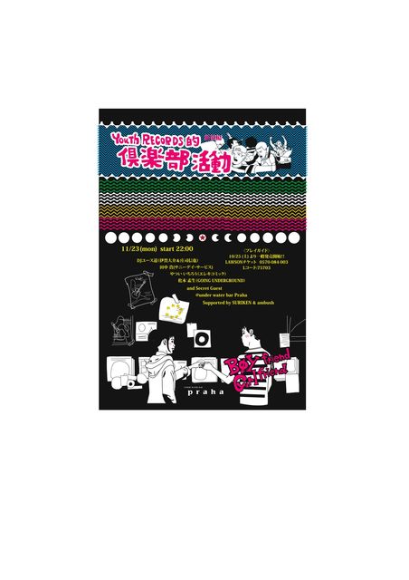 ■Youth records的 倶楽部活動〜新潟遍〜 Supported by SURIKEN & ambush 11/23(日) start 22:00 @under water bar Praha DJユース道(伊賀大介&庄司信也) 田中 貴(サニーデイ・サービス) やつい いちろう(エレキコミック) 松本 素生(GOING UNDERGROUND) and Secret Guest(只今、映画の撮影の為、名前が出せません・・・決定は一週間前くらい?) 前売り3500円 / 当日4000円 どちらも1DRINK付 ※少しお高いですけど、このメンバーなのでお許しを。 <プレイガイド> 10/25(土)より一般