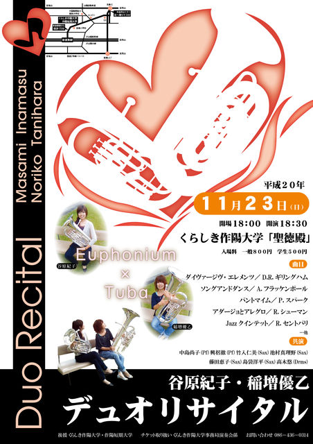 下記の通り演奏会が、開催されます。お忙しい最中とは存じますが、みなさまお誘い合わせの上ご来場いただけたら幸いです。 記 ♪谷原紀子・稲増優乙 デュオリサイタル♪ 日 時:2008年11月23日(日) ●開場 18:00 ●開演 18:30 会 場:くらしき作陽大学内 「聖徳殿」 入場料:一般800円 学生500円 曲 目: ◆D.R.ギリングハム/ダイヴァーシヴ・エレメンツ ◆A.フラッケンポール/ソングアンドダンス ◆P.スパーク/パントマイム ◆R.シューマン/